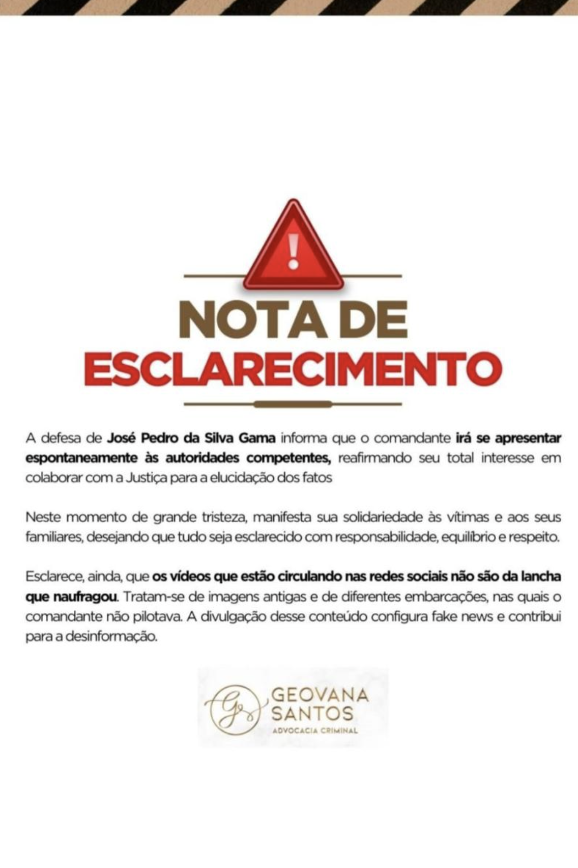 A defesa também se manifestou sobre vídeos que circulam em aplicativos de mensagens e redes sociais, atribuídos ao comandante. Segundo a advogada, as imagens não correspondem à lancha envolvida no acidente — identificada como Lima de Abreu — e não teriam qualquer ligação com José Pedro.
