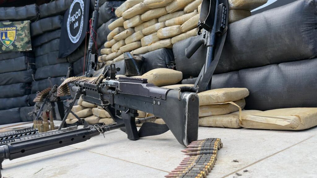 Nas embarcações foi apreendido um arsenal com oito fuzis de calibres diversos e duas metralhadoras .60 (arma de guerra com cadência de tiro de 500 a 650 disparos por minuto), 3.063 munições, 51 carregadores e granadas, além de duas lanchas equipadas com quatro motores e antenas Starlink.
