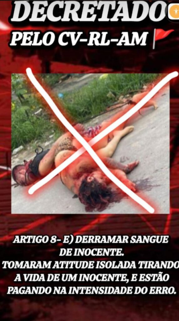 Nas redes sociais, uma postagem de integrantes do Comando Vermelho aparecem assumindo a autoria. A publicação afirma que o casal descumpriu uma das cláusulas do “decreto” da facção, que foi “derramar sangue inocente”. Nesse contexto, desovar os corpos em uma área que outrora era de domínio do PCC seria uma provocação contra a facção rival. Veja: