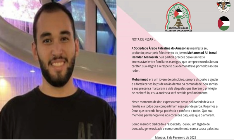 Em nota, a Sociedade Árabe Palestina do Amazonas manifestou seu profundo pesar pelo falecimento de Mohammad Ali Ismail.