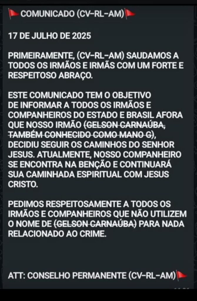 O Comando Vermelho (CV), uma das maiores facções criminosas do país, surpreendeu ao emitir nesta quinta-feira (17) um comunicado oficial anunciando a conversão religiosa de Gelson Carnaúba, conhecido como “Mano G”, e seu desligamento simbólico das atividades criminosas. Segundo o texto assinado pelo chamado “conselho permanente do Comando Vermelho”, o ex-líder decidiu “seguir os caminhos do Senhor Jesus” e está agora “na bênção”.