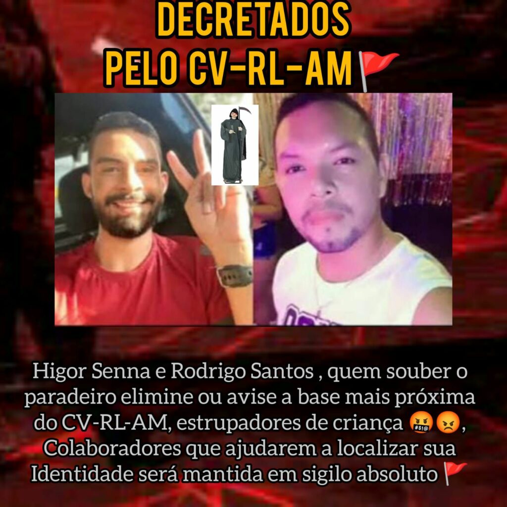 Em publicação nas redes sociais, integrantes da facção criminosa anunciaram que, quem souber a localização deles, pode ‘eliminá-los’, ou informar o paradeiro dos estupradores a uma base próxima da organização.