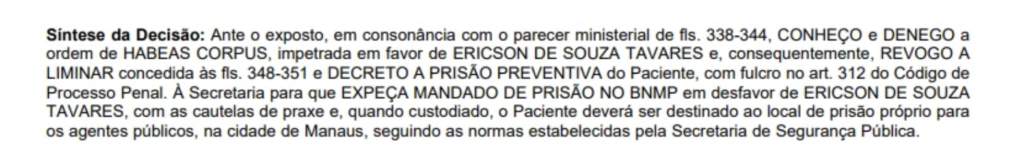 Com isso, o Ministério Público do Amazonas (MPAM) entrou com um pedido que afirmava a necessidade da prisão de Ericson, visto que a ação dele foi considerada “um desrespeito às investigações e às vítimas dos crimes de extorsão e sequestro pelos quais ele e outros policiais foram acusados”, de acordo com o MP.