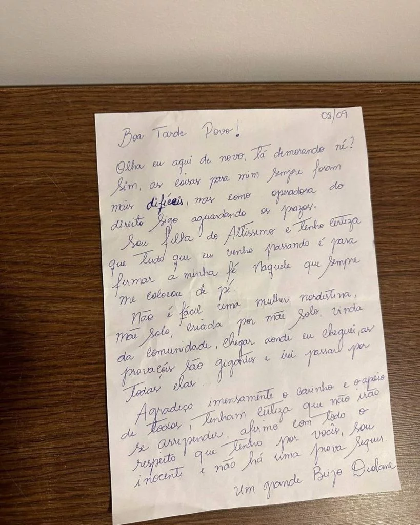 Brasil – A influenciadora digital Deolane Bezerra, detida desde a última quarta-feira (4) no âmbito da operação “Integration”, divulgou uma carta escrita à mão durante uma visita de suas irmãs, Dayanne e Daniele Bezerra, na penitenciária. O conteúdo da carta foi compartilhado em suas redes sociais a pedido da própria Deolane, conforme relatado pelo portal Metrópoles.