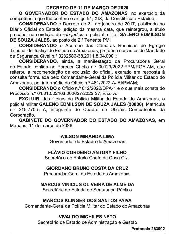 Manaus – O Governo do Amazonas oficializou, no dia 11 de março de 2026 , a exclusão definitiva do policial militar Galeno Edmilson de Souza Jales das fileiras da Polícia Militar do Estado do Amazonas (PMAM). A decisão, assinada pelo governador Wilson Miranda Lima, ocorre dias após o oficial ser preso preventivamente sob a acusação de facilitar a saída irregular de dezenas de policiais do presídio militar que ele comandava.