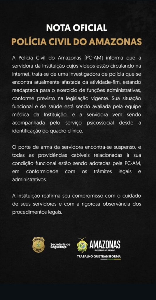 “A Polícia Civil do Amazonas informa que a servidora cujos vídeos estão circulando na internet encontra-se atualmente afastada da atividade-fim, estando readaptada para o exercício de funções administrativas”, diz trecho da nota.