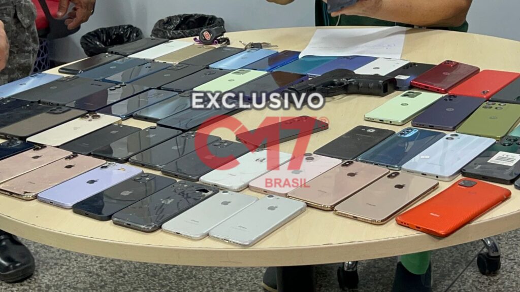 Durante a abordagem, os policiais apreenderam dois baldes cheios de celulares — ao todo, 62 aparelhos foram recuperados.