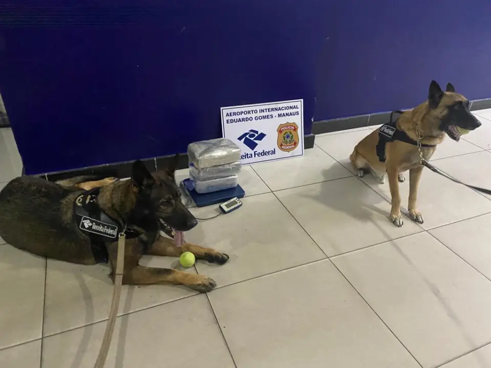 Manaus – A Equipe K9 da Receita Federal em Manaus realizou nesta sexta-feira (9), durante a madrugada, operação de combate ao contrabando e descaminho no Aeroporto Internacional Eduardo Gomes, que resultou na apreensão de 14,7 kg de drogas ilícitas.