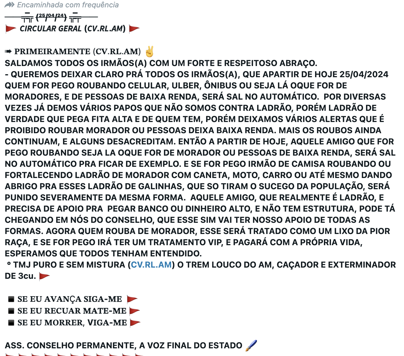 No aviso, o Comando Vermelho deixa claro que os três envolvidos na ação criminosa serão mortos e que o assassinato deles servirá de lição para outros bandidos, que insistem em assaltar pessoas de baixa renda e da própria comunidade. A facção, segundo o comunicado, repudia este ato.