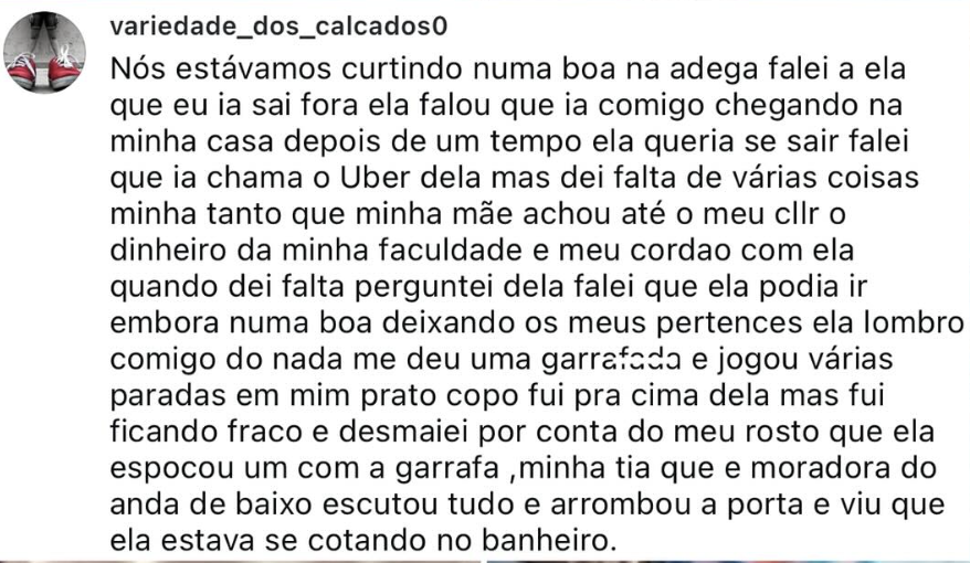 No entanto, a versão do agressor não se sustenta diante das evidências. Alana sofreu ferimentos graves, com hematomas e cortes profundos, indicando uma agressão brutal. A vítima relatou à polícia que Luiz a jogou no chão e desferiu diversos pisões em sua cabeça, resultando em lesões severas.