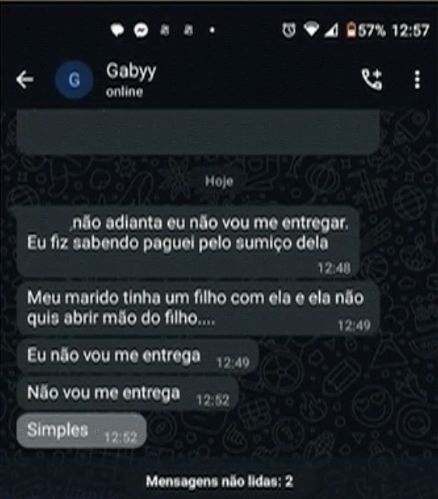Antes do assassinato, Gabrielle já havia enviado mensagens ameaçadoras diretamente à vítima, deixando claro que vinha planejando algo grave: “Acredito que não preciso ir até você, só estou deixando bem claro. A próxima, não te mando mensagem. Sei muito bem por onde anda.” Segundo a Polícia Civil, esses registros reforçam o caráter premeditado do crime e a intenção de eliminar Laís por completo da vida da filha.