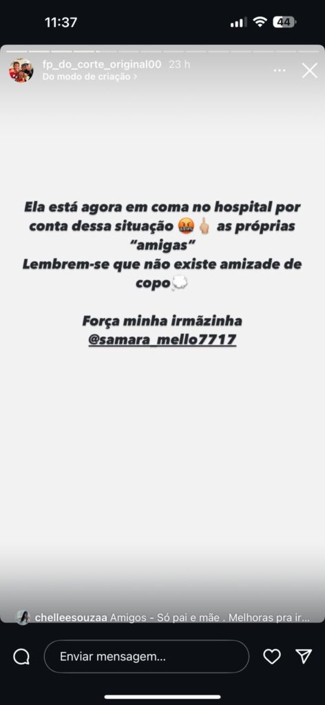 O irmão de Samara, abalado, desabafou sobre o estado crítico da jovem e fez um alerta à população. “Amigo de verdade só pai e mãe”, disse, destacando a traição que, segundo ele, marcou a relação entre Samara e Renata. A família agora se agarra à esperança de que Samara se recupere, enquanto cobra justiça.