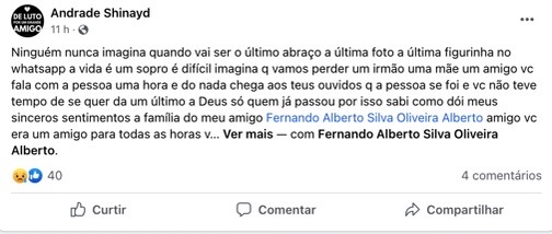Nas redes sociais, amigos e familiares de Fernando se comoveram com a perda. Mensagens de carinho e condolências foram publicadas nas redes sociais nas últimas horas. Confira:
