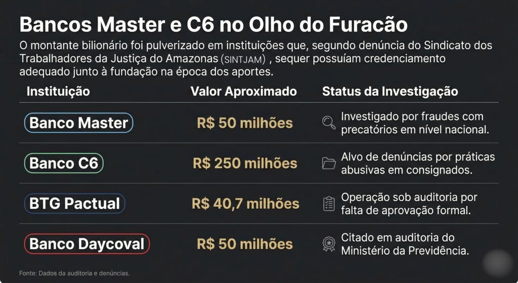 A investigação, realizada no âmbito da operação “Sine Consensu”, apura suspeitas de irregularidades na aplicação de aproximadamente R$ 390 milhões em Letras Financeiras de bancos privados. Entre as instituições que receberam os aportes estão C6 Bank, Banco Master, Banco Daycoval e BTG Pactual. Segundo a auditoria do Ministério da Previdência que deu origem ao caso, os investimentos teriam ocorrido entre junho e setembro de 2024, em alguns casos sem aprovação formal do Comitê de Investimentos ou com instituições que não estavam devidamente credenciadas.