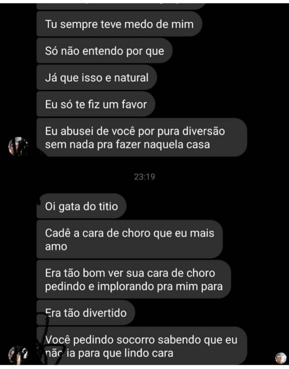 Em outras mensagens o criminoso relata a satisfação do sofrimento da vítima durante os abusos: