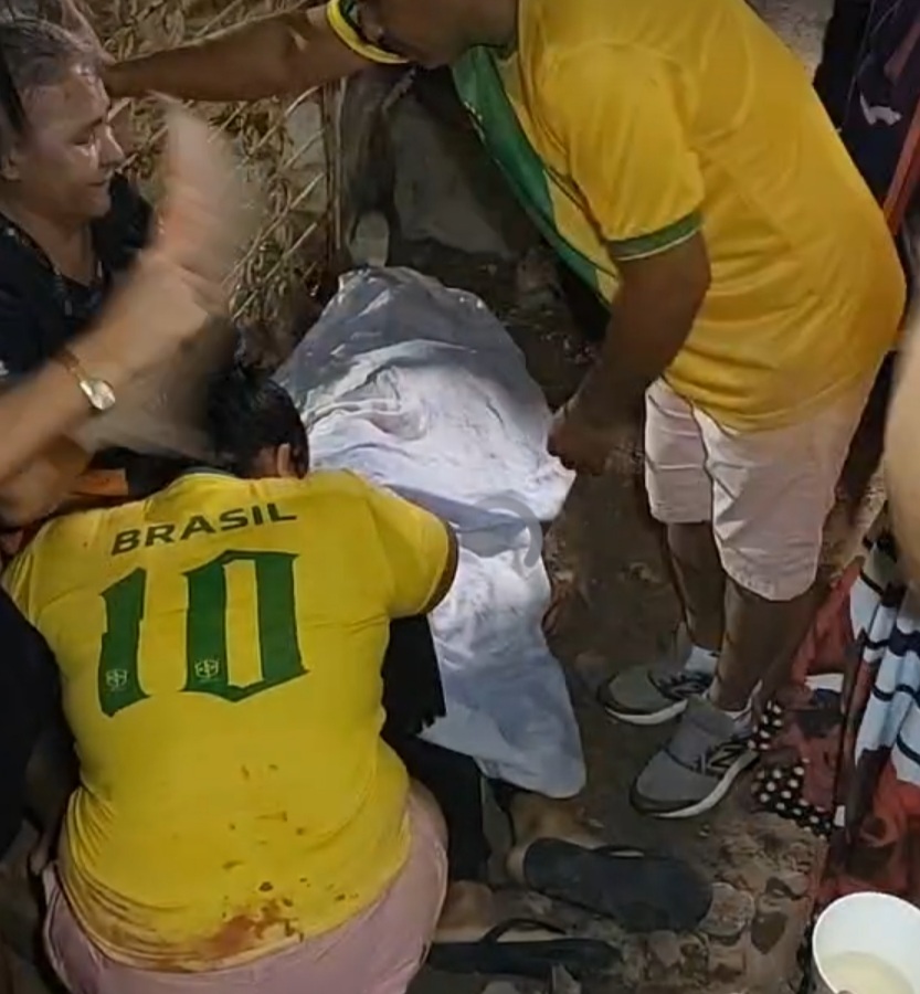 A esposa da vítima desabou no momento em que viu o marido jogado no chão coberto por um pano branco. Abraçada com uma senhora, que supostamente seria a mãe da vítima, ela chora e grita: “Marido, eu te falei!”.
