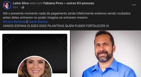Há duas semanas o mesmo candidato é denunciado por cabos eleitorais que dizem ter levado calote. Uma das contratadas, Rafaela Ferreira, conta que a primeira negociação era de pagamento de R$ 200 por quinzena para trabalhar na campanha de Saulo Batista, mas na hora de receber só passaram R$ 100. “E o resto das pessoas que não receberam nada ainda?”, questiona.