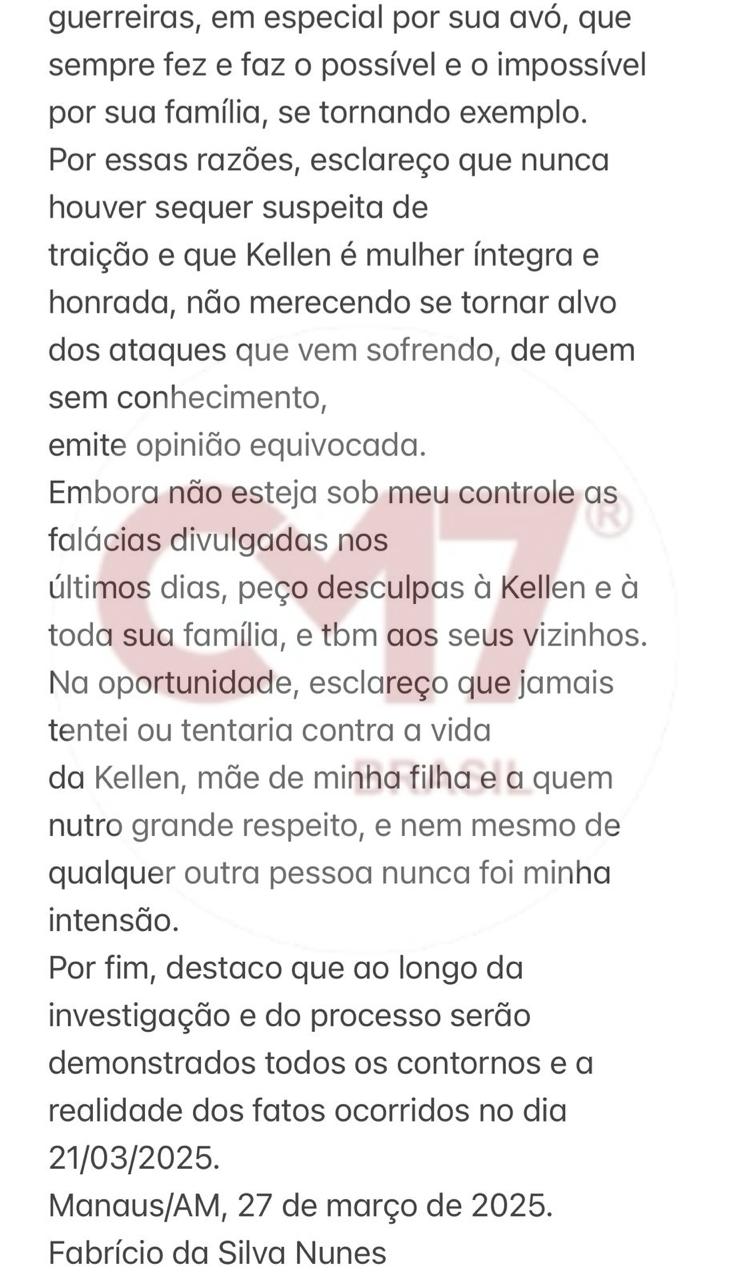 Manaus – O empresário Fabrício Nunes, proprietário do Motel Royal, se entregou à polícia na manhã desta quinta-feira (27), após quase sete dias foragido. Ele é acusado de tentativa de homicídio contra o também empresário Fabrício Valle, dono da Pizzaria Faraó, em um caso que chocou a capital amazonense. Horas antes de se apresentar às autoridades, Nunes escreveu uma nota de esclarecimento, na qual aborda sua relação com a ex-companheira, a advogada Kellen Clyssya de Souza Lima, e nega qualquer intenção de atentar contra a vida dela.