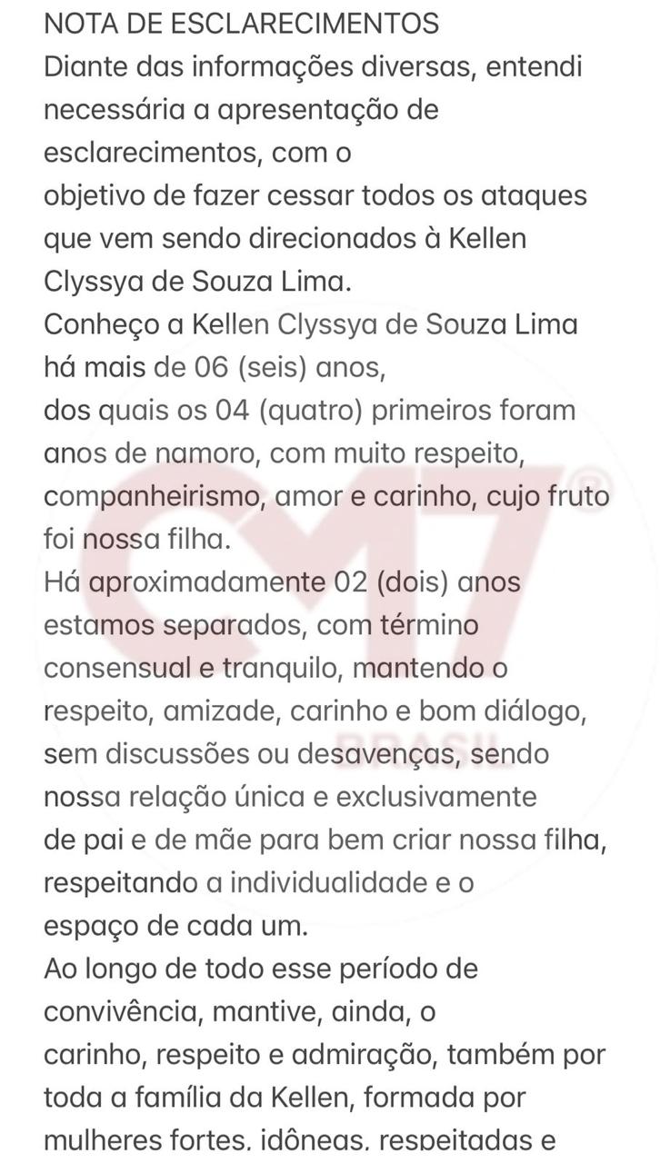 Kellen Clyssya, que manteve um relacionamento de quatro anos com Nunes e com quem tem uma filha, afirmou que o término ocorreu há dois anos de forma consensual e que ambos mantinham uma relação pacífica voltada à criação da filha.