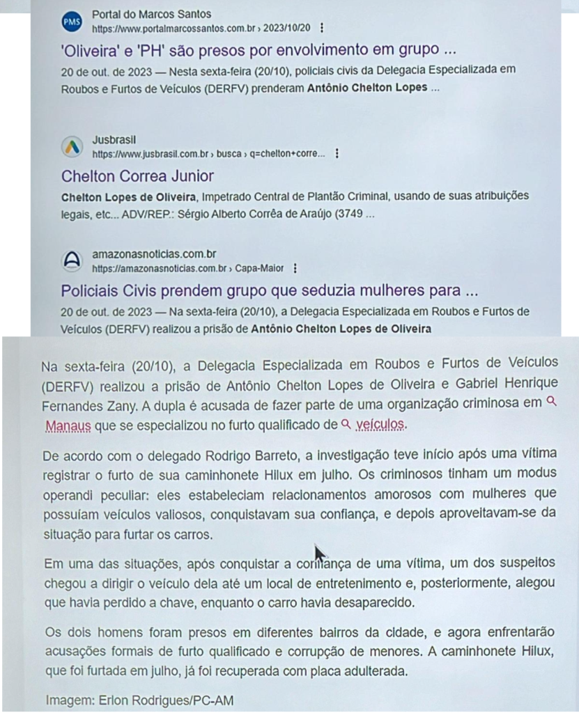 A investigação particular também expõe que Antônio Chelton já foi preso ano passado em 2023, acusado de se aproximar de vítimas de poder aquisitivo e seduzir mulheres, para então depois roubar seus carros e pertences.