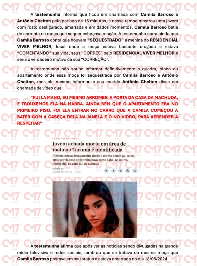 Manaus – Um relatório produzido por uma investigação particular trouxe novas revelações sobre o homicídio da babá Geovana Costa Martins, contestando as conclusões da Polícia Civil do Amazonas. O documento aponta erros no processo investigativo, especialmente na identificação de Eduardo Gomes da Silva como um dos envolvidos no crime. De acordo com o relatório, Eduardo foi confundido com Napoleão Pinheiro Lima, homem que, junto com Camila Barroso, foi visto no velório da vítima. O relatório sugere ainda que o verdadeiro cúmplice de Camila seria Antônio Chelton Lopes de Oliveira, companheiro dela, e não Eduardo, como afirmado inicialmente pelas autoridades.