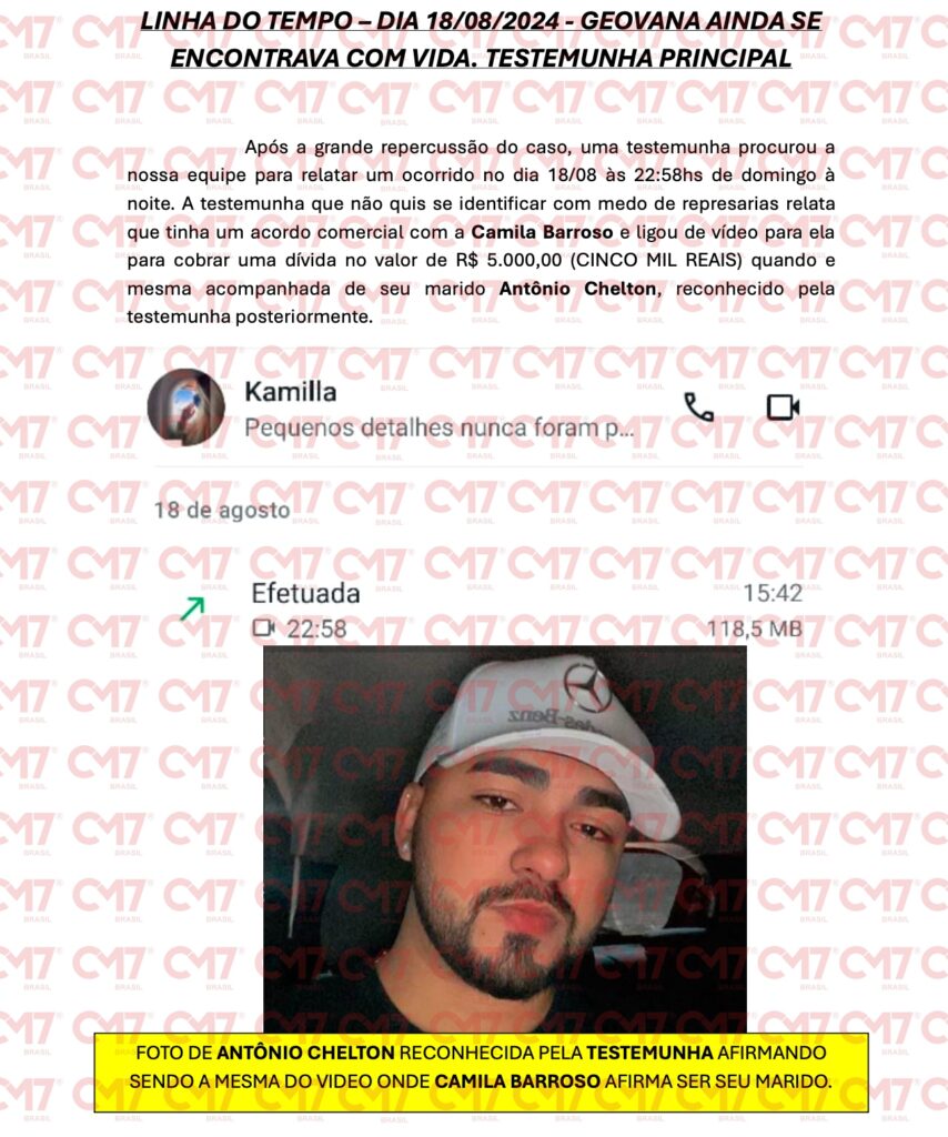 De acordo com relatos e evidências obtidas pela polícia, Camila Barroso e um cúmplice teriam sequestrado Geovana no Residencial Viver Melhor, após um desentendimento envolvendo tráfico de drogas e uma “correção” imposta pela dupla. Uma testemunha relatou ter visto Geovana amarrada e sendo agredida por Camila em uma chamada de vídeo dias antes do corpo ser encontrado.