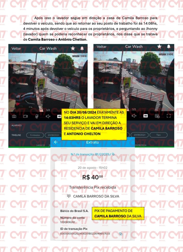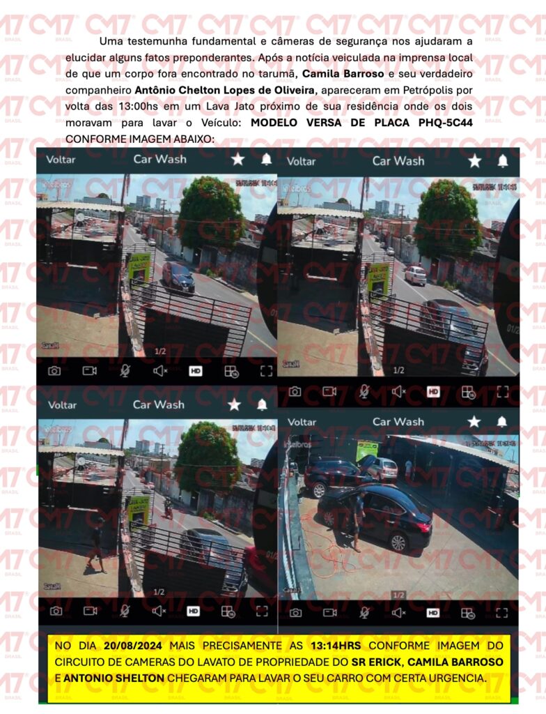 Ainda segundo a investigação particular, Camila e Antônio teriam lavado o carro utilizado no crime no mesmo dia em que o corpo de Geovana foi descoberto. Câmeras de segurança de um lava-jato próximo à residência dos suspeitos registraram o momento em que o veículo foi limpo às pressas, como se quisessem se livrar de manchas de sangue.