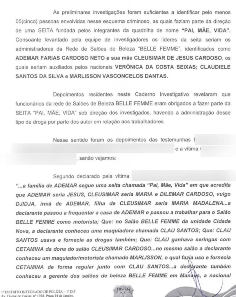 Manaus – As preliminares investigações da Polícia Civil do Amazonas (PC-AM) revelaram detalhes chocante sobre uma seita intitulada “Pai, Mãe, Vida”, liderada por Ademar Farias Cardoso Neto e sua mãe Cleusimar de Jesus Cardoso. O inquérito aponta que Ademar, irmão da ex-sinhazinha do Boi Garantido, Djidja Cardoso, acreditava ser Deus no grupo.