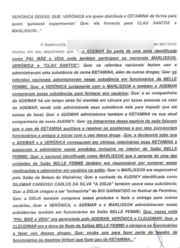 Uma testemunha revelou que Ademar acreditava ser Jesus na seita, que Cleusimar se via como Maria, e Djidja, irmã de Ademar, seria Maria Madalena. Outros depoimentos confirmam o uso e fornecimento de drogas pelos líderes da seita aos funcionários dos salões. Claudiele Santos e Marlisson Dantas eram mencionados como fornecedores frequentes de ketamina, obtida em clínicas veterinárias e administrada nos salões Belle Femme.