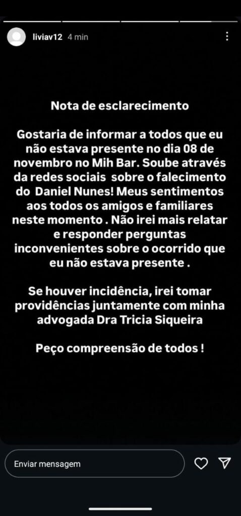 Após a repercussão da entrevista, Lívian se manifestou nas redes sociais, negando qualquer envolvimento no assassinato. Em seus stories, a ex-namorada de Daniel publicou: “Gostaria de informar que não estava presente no dia 8 de novembro no Mih Bar. Soube através das redes sociais sobre o falecimento de Daniel. Meus sentimentos a familiares e amigos. Não irei mais relatar ou responder perguntas inconvenientes sobre o ocorrido, já que eu não estava presente. Se houver incidências, tomarei providências junto com minha advogada. Peço compreensão de todos”.