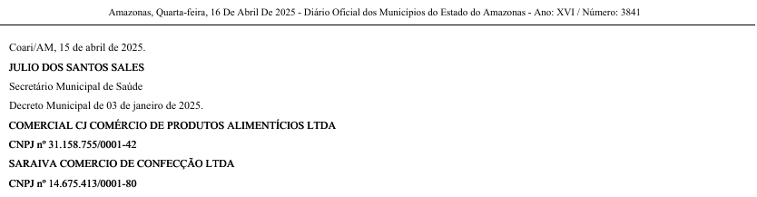 Erick Pinto Saraiva é ligado à empresa Saraiva Comércio de Confecção Ltda, que aparece em processos de contratação pública no interior do estado. A empresa foi cotada para receber mais de R$ 3,3 milhões do município de Coari (AM).