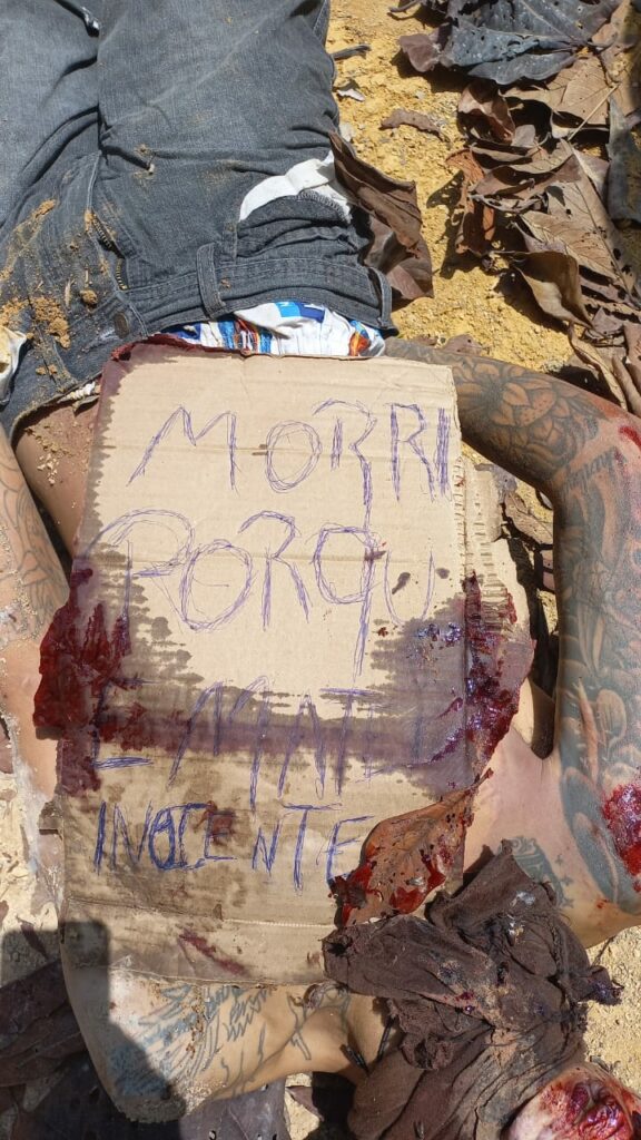 Segundo informações preliminares, moradores da área encontraram o corpo por volta das 8h30 da manhã com um bilhete de facção que dizia: ”Morri porque matei inocente”.
