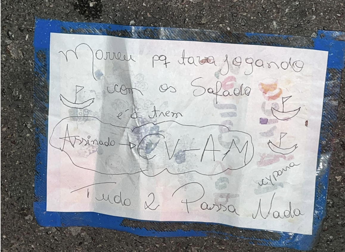 De acordo com informações da polícia, o crime teria ocorrido por volta das 2h30 quando moradores da área ouviram diversos tiros e, ao ver do que se tratava, encontraram o homem com um bilhete em cima do corpo. “Morreu porque tava jogando com os safados. Tudo 2 passa nada. Assinado CV-AM”.