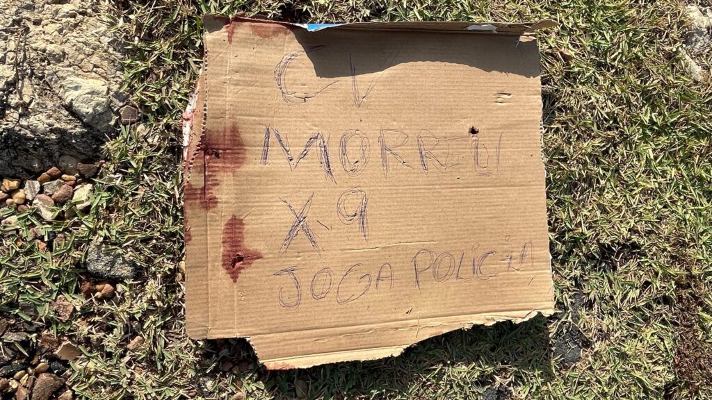 Ao lado do corpo, os criminosos deixaram uma placa com a inscrição: “Morreu X9 que joga com a polícia”, seguida da assinatura “CV”, sigla da facção Comando Vermelho.