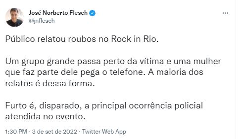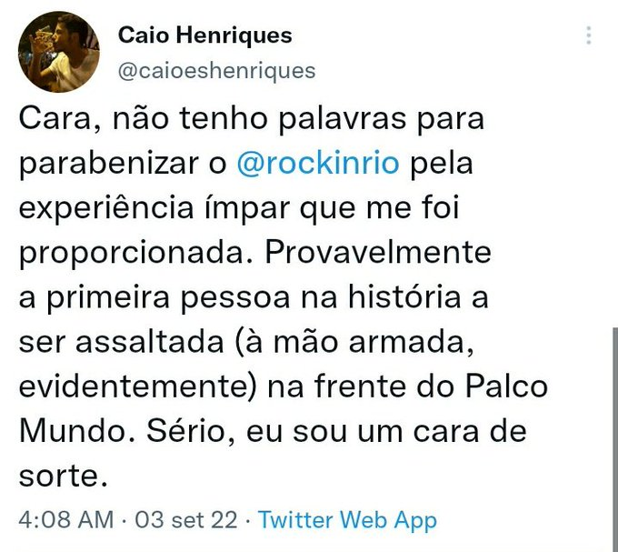 Aquela quadrilha sulamericana de furto de celular é um clássico em todo Rock in Rio desde 2011 mas ASSALTO A MÃO ARMADA é nova. pic.twitter.com/OSAVr60ETt— Renato Bacon ⭐️ (@RenatoBacon) September 3, 2022