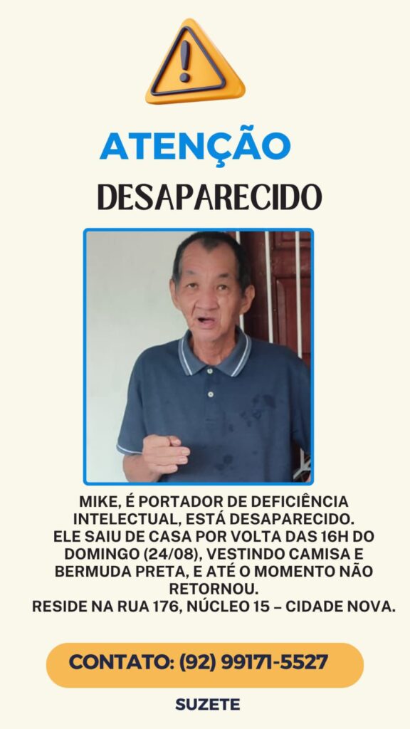 Manaus – Familiares estão à procura de um idoso conhecido como Mike, que possui deficiência intelectual e está desaparecido desde a tarde do último domingo (24).