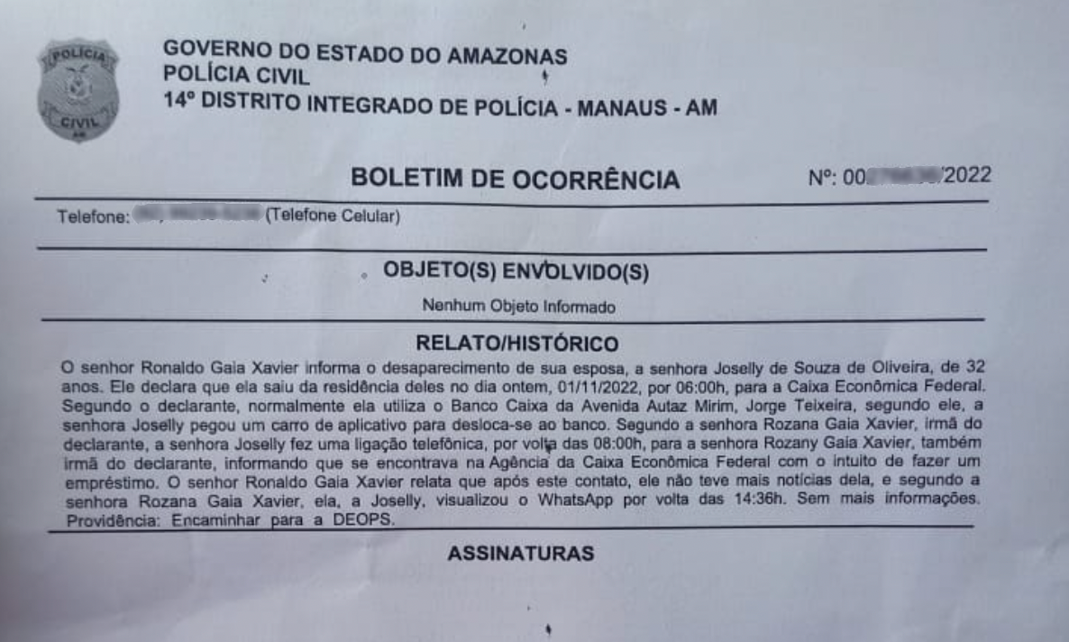 O caso será investigado pela Delegacia Especializada de Ordem Política e Social (DEOPS). Qualquer informação sobre o paradeiro de Joselly deve ser repassada para os familiares através do 92 98641-8131 (Adenildo Castro) ou pelo 92 98462-8087 (Rozana Gaia).