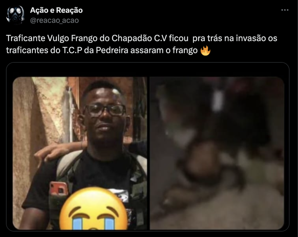Segundo informações, o confronto ocorreu entre os complexos da Pedreira e do Chapadão, fronteira na qual as Facções do Terceiro Comando Puro (TCP) e Comando Vermelho (CV) disputam o controle do tráfico de drogas, evidenciando as consequências nefastas da disputa entre os grupos criminosos. A barbárie com a qual “Frango” foi submetido reflete a falta de limites e humanidade presentes nessas guerras de facção. Segundo informações, vulgo “Frango” teria ficado pra trás durante a invasão do TCP e acabou sendo brutalmente executado.