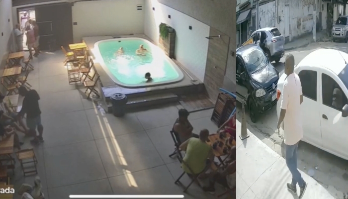 O circuito interno do espaço em que o evento acontecia mostra o momento em que criminosos armados invadem o espaço. Eles não anunciam assalto. Parecem procurar por alguém que estaria no evento e atiram contra frequentadores do local.