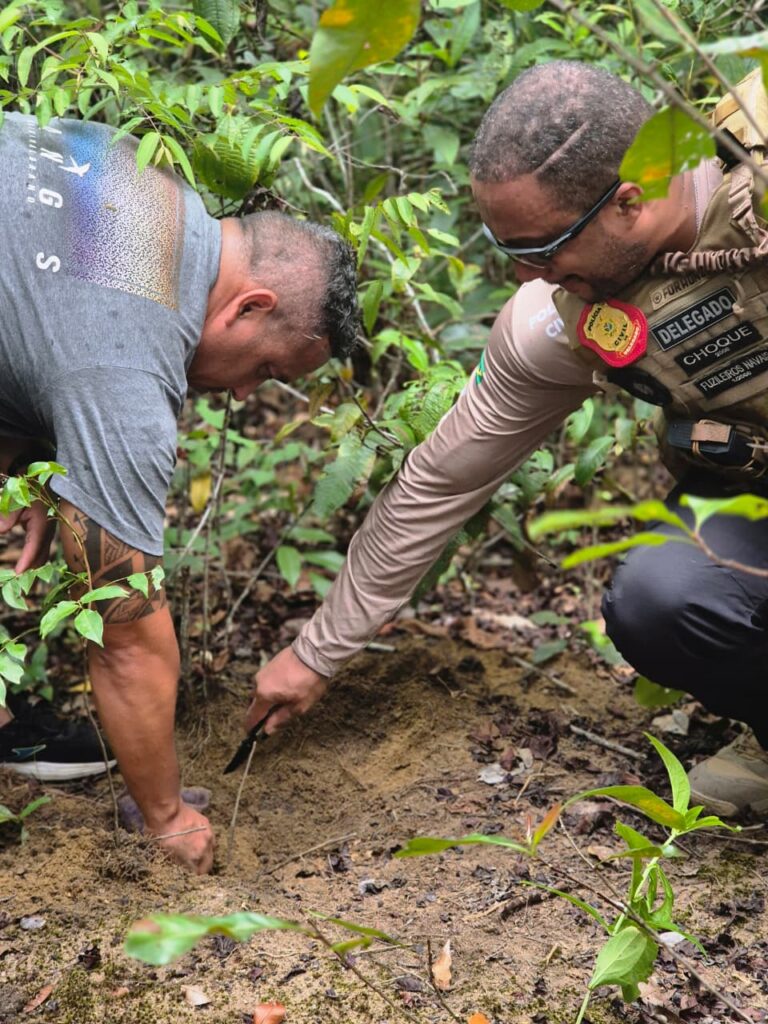 “Durante as diligências, efetuamos a prisão do indivíduo em uma ‘boca de fumo’, no bairro Ipiranga. Com ele, apreendemos entorpecente, supostamente maconha. Na ocasião, ele confessou o crime e indicou o ponto onde havia enterrado parte do material usado no roubo ao estabelecimento”, relatou o delegado.