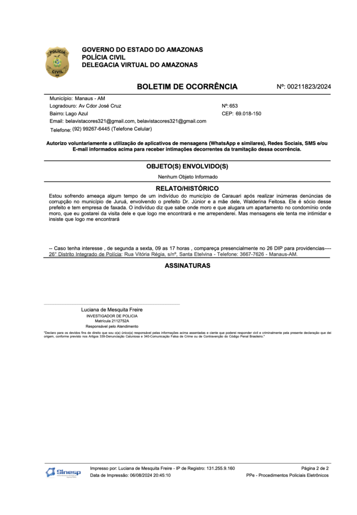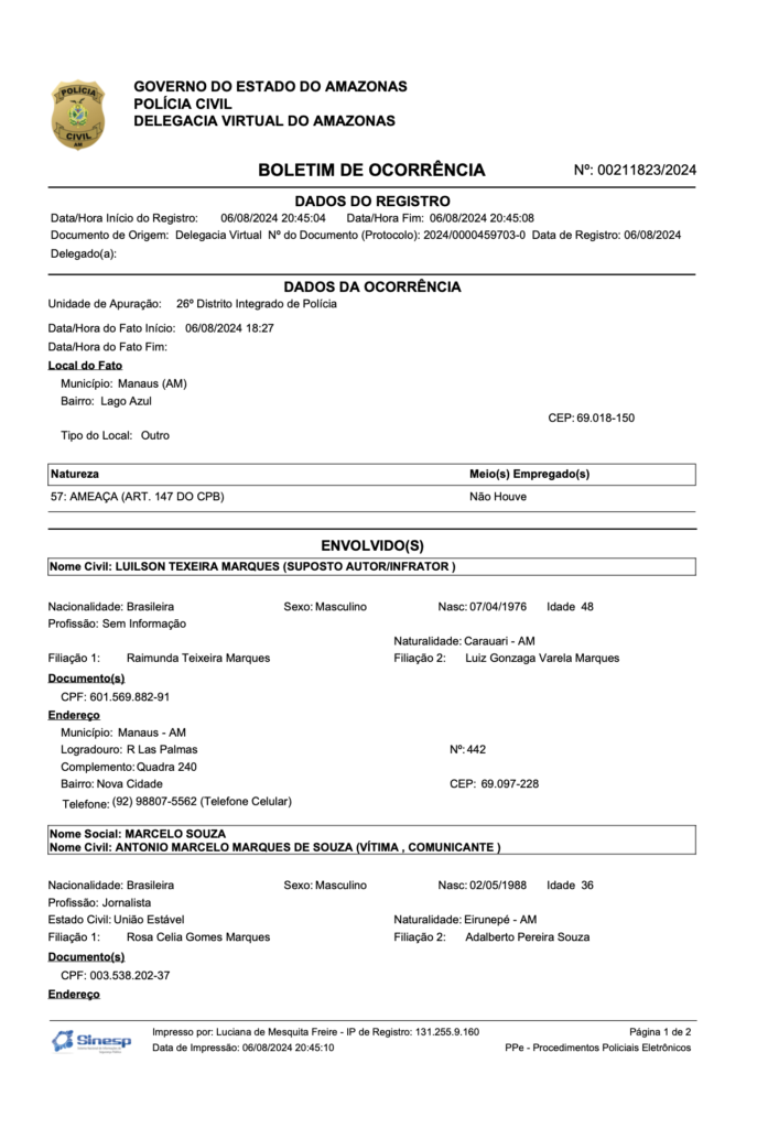 Hoje foi publicado o resultado das convenções partidárias nos municípios do Amazonas, após isso, Luilson começou a mandar mensagens e a ligar via WhatsApp para ameaçar Marcelo que, imediatamente, realizou mais um boletim de ocorrência contra o indivíduo.