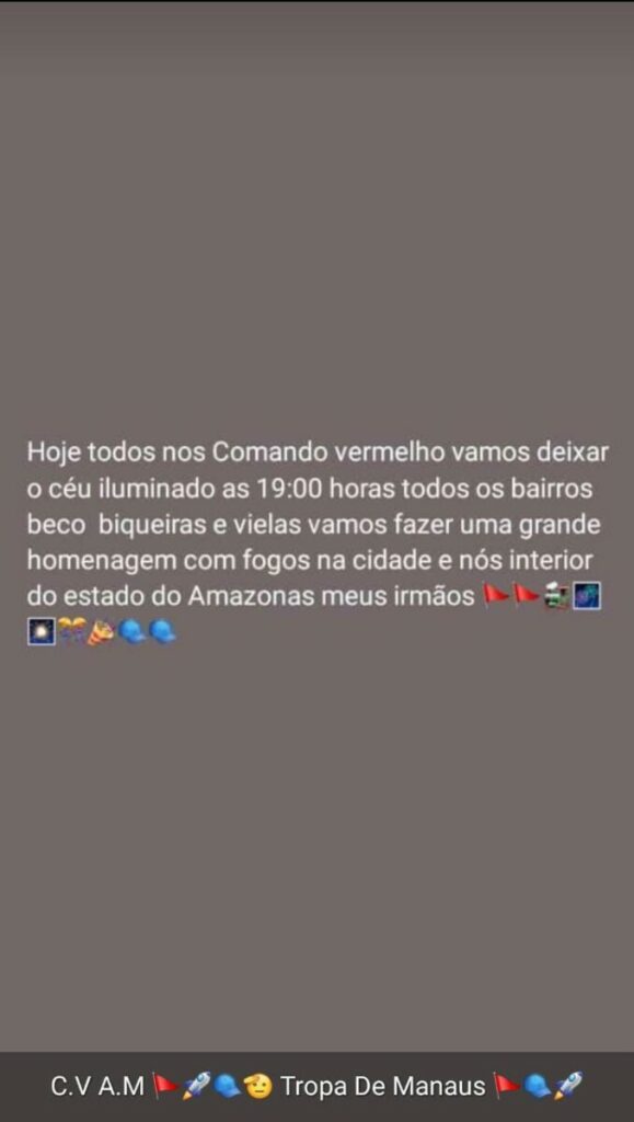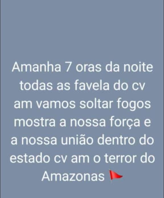 Manaus – Circula nas redes sociais um suposto comunicado da facção Comando Vermelho (CV) sobre um foguetório na noite desta sexta-feira (10) em Manaus.