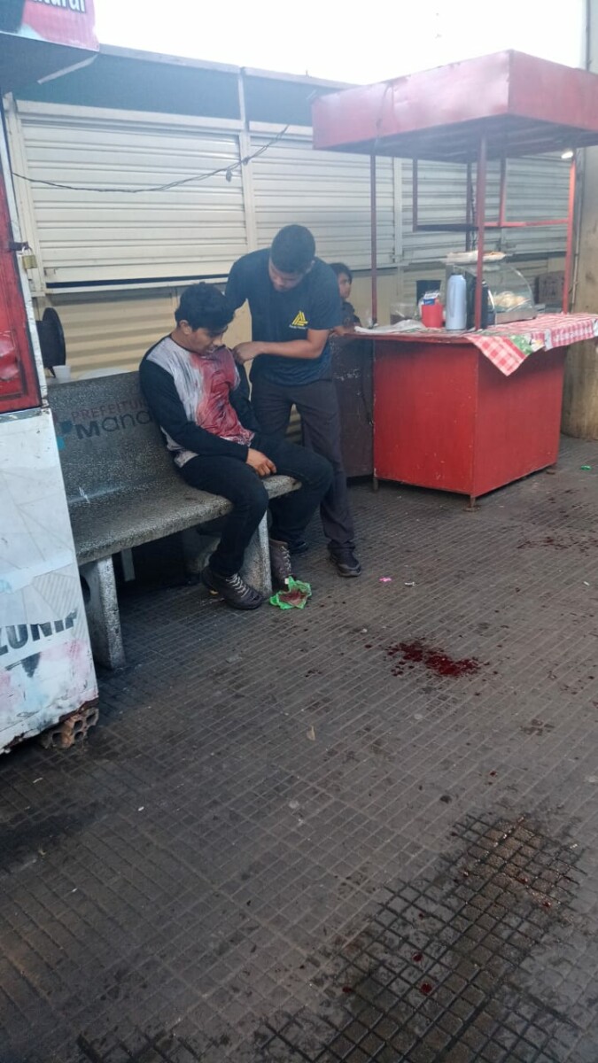 Na imagem obtida com exclusividade, é possível ver o homem sentado no banco do terminal com a roupa ensanguentada, além de sangue no chão. Perto dele, há um homem que o ajuda e aguarda junto com ele o atendimento médico.