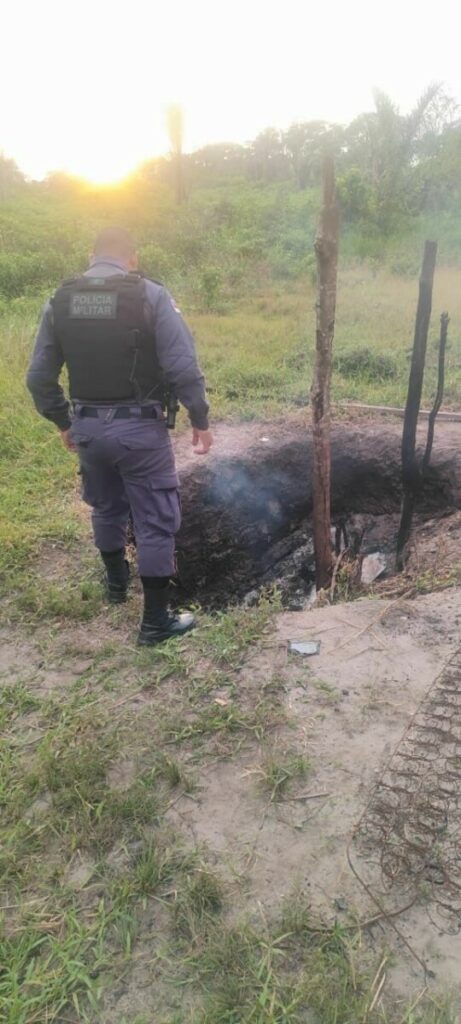 O comandante do 2º PEL, Capitão Ribeiro, destacou que os policiais militares foram até o local e encontraram, em um buraco, um corpo completamente carbonizado. Durante a verificação, constataram-se restos mortais de outra pessoa, nas mesmas condições do primeiro corpo.