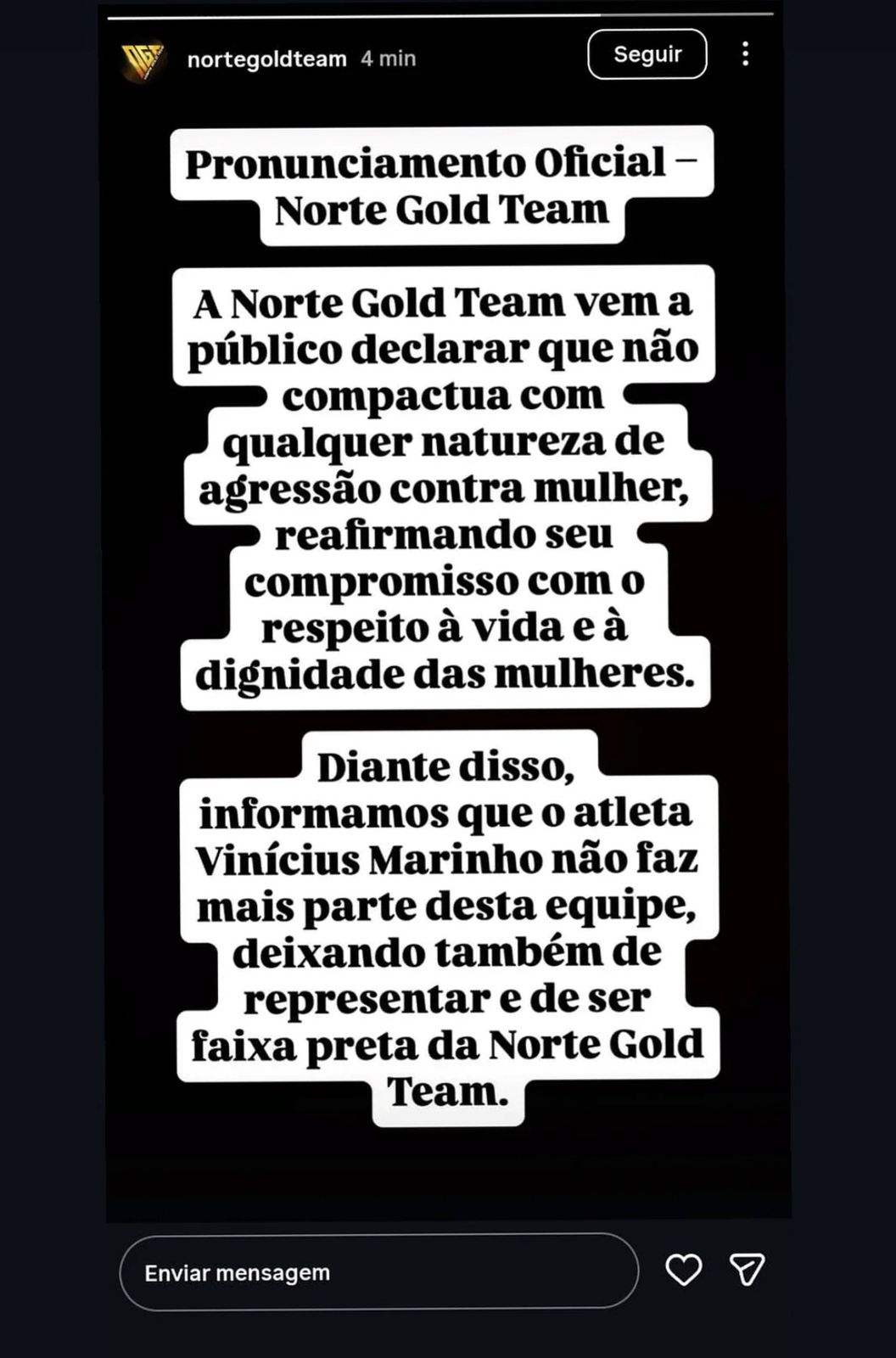 Em nota publicada nas redes sociais, a Norte Gold Team afirmou que “não compactua com qualquer natureza de agressão contra mulher” e reforçou seu compromisso com o respeito à vida e à dignidade das mulheres. A equipe confirmou que Vinicius não faz mais parte do time e que ele deixa, inclusive, de ser reconhecido como faixa preta da academia.