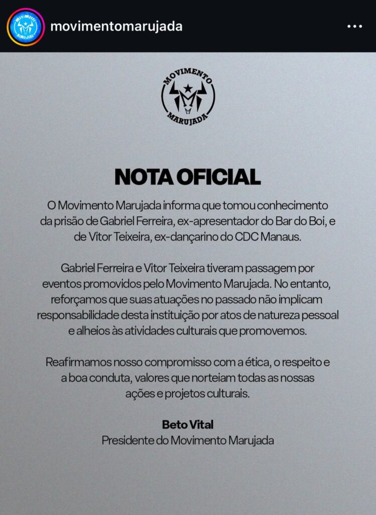 A traição de Gabriel, que usou sua proximidade com o padrinho para facilitar o roubo, gerou revolta e surpresa, especialmente entre a torcida do Boi Caprichoso, onde ele era uma figura conhecida por sua atuação no Bar do Boi. O Movimento Marujada, ligado ao Caprichoso, emitiu uma nota oficial esclarecendo que Gabriel e Vitor tiveram passagens por eventos da instituição, mas que suas ações criminosas são de natureza pessoal e não têm relação com as atividades culturais promovidas. “Reafirmamos nosso compromisso com a ética, o respeito e a boa conduta”, declarou Beto Vital, presidente do Movimento.