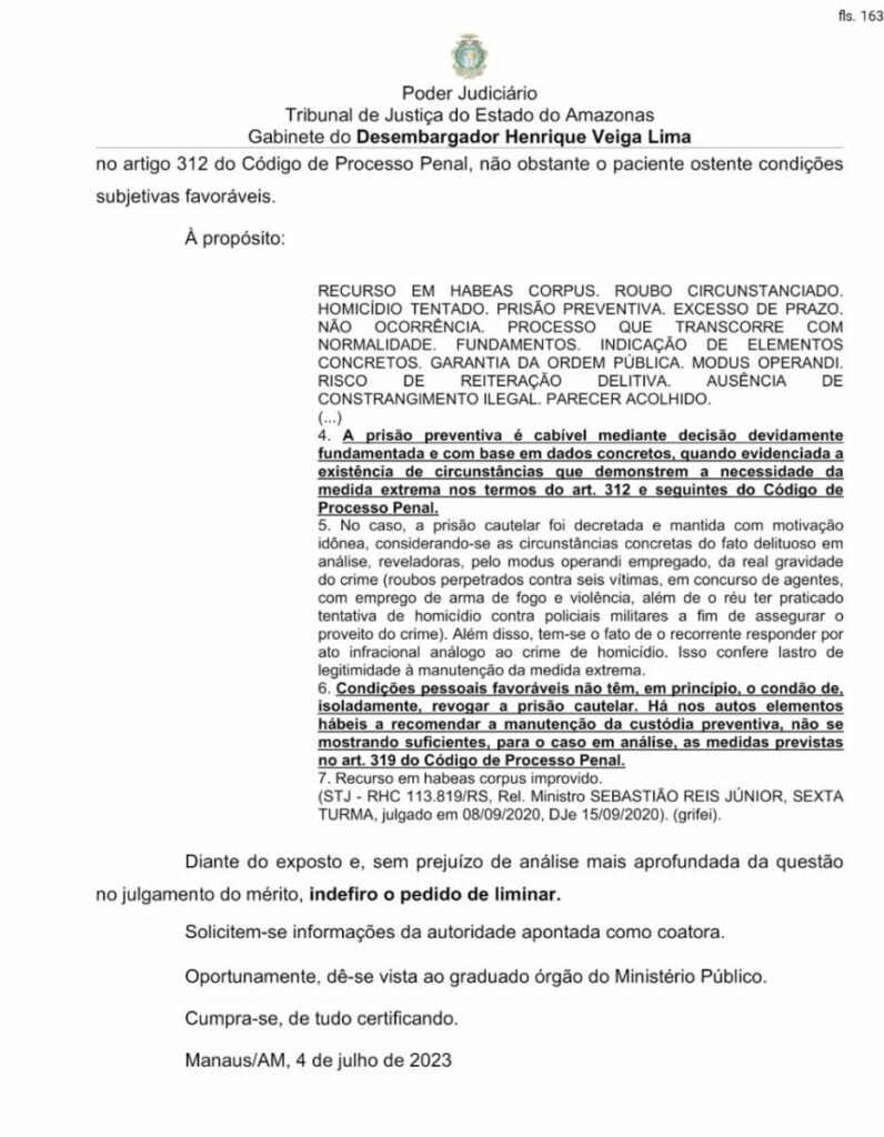 Além da investigação inicial do esquema das rifas, o documento ressalta as acusações ainda mais sérias enfrentadas pelos influenciadores. O documento menciona crimes de roubos, utilizando armas de fogo e violência, além de uma tentativa de homicídio contra policiais militares. Essas circunstâncias preocupantes contribuíram para a decisão do desembargador de manter a prisão dos envolvidos. Veja documento:
