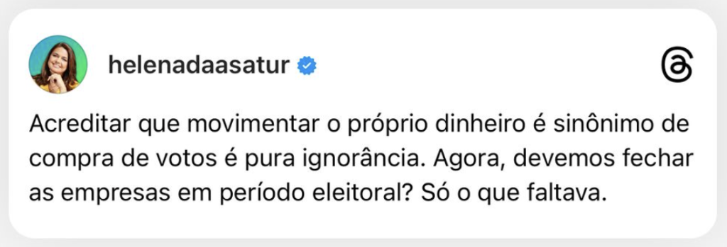 Nas redes sociais, a esposa do empresário, a deputada federal Helena da Asatur (MDB), fez um pronunciamento sobre o caso. “Acreditar que movimentar o próprio dinheiro é sinônimo de compra de votos é pura ignorância. Agora, devemos fechar as empresas em período eleitoral? Só o que faltava”, afirmou.