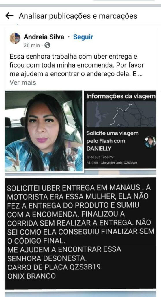 Manaus – Daniele Cristina, motorista de aplicativo há três anos, procurou equipe de reportagem do Portal e TV CM7 Brasil na noite desta sexta-feira (18), para denunciar uma cliente que teria divulgado sua foto nas redes sociais e a acusado de furtar sua encomenda.