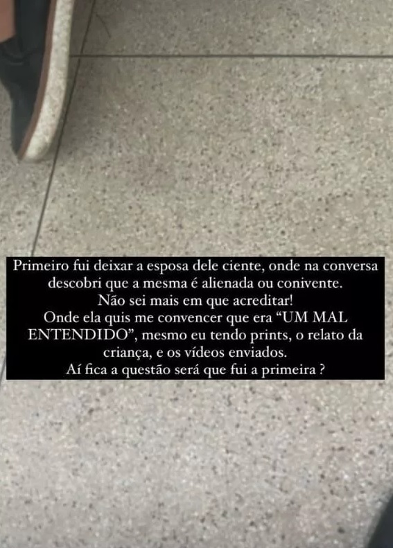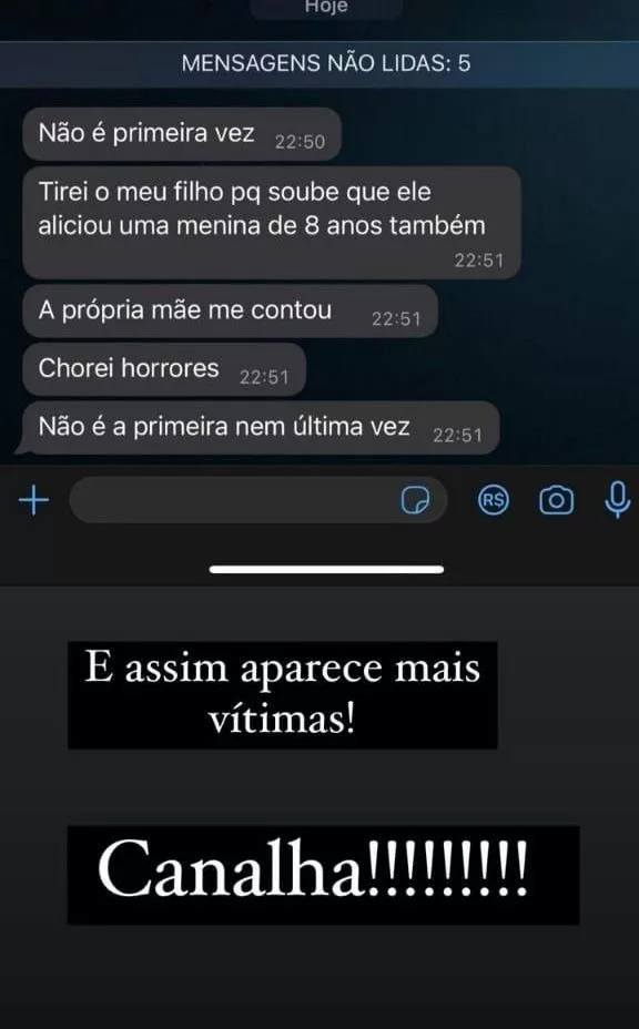 “Ele trabalhou muito para conseguir a confiança dela durante esse tempo. Depois de enviado, ele induziu para que ela apagasse e ainda me elogiou. Nojo! Mas, ela apagou da conversa, e não da galeria”, escreveu em publicação nas redes sociais no último sábado (25).